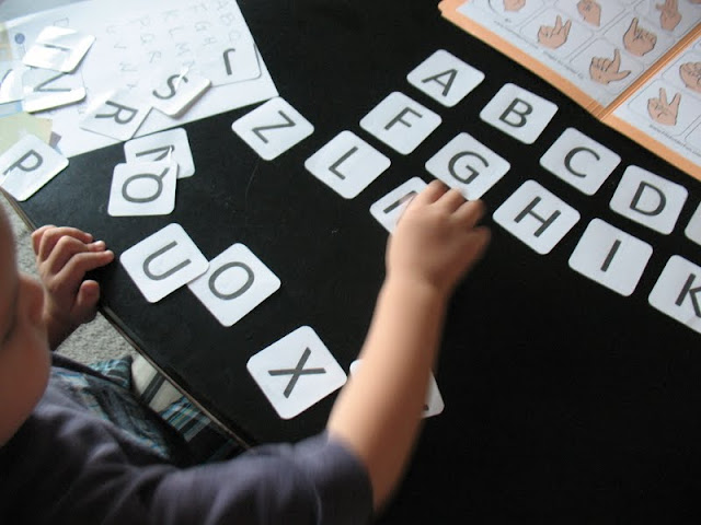 I created this folder game for Peter. He loves alphabets and sign language. He is able to match the ABC squares to the signing squares. He was not doing it here though.